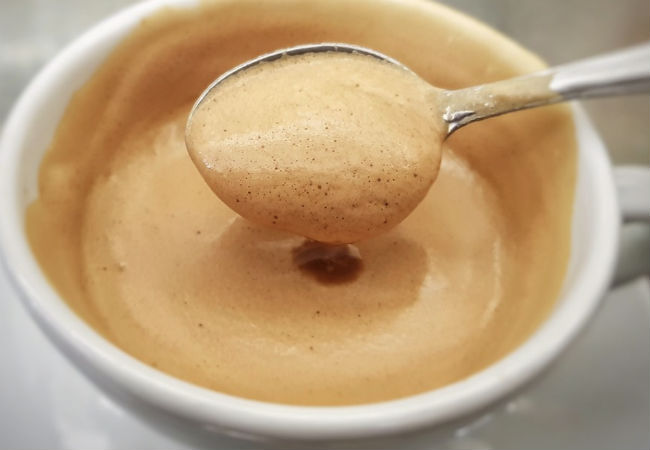 Если собираетесь делать только одну порцию, то и всех ингредиентов нужно брать меньше — всего по столовой ложке, молока так же, стакан. Засыпаем кофе и сахар в блендер, заливаем водой и взбиваем на самой высокой скорости миксером минуту-две. Получится однородная крем-масса, которая и станет основой нашего капучино. Перекладываем порцию в стакан, заливаем горячим молоком и аккуратно размешиваем ложкой. Сверху добавляем еще немного кофейного крема и подаем на стол.